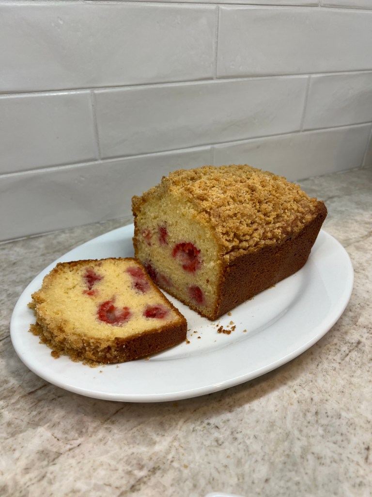 Welcome to my first recipe! This is a delicious raspberry lemon loaf made with a yummy crumble topping. It comes together quite simply, and is easily adaptable to your likings.